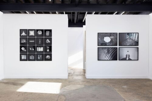 From left, an arrangement of black and white images of small mementos brought by Cuban immigrants to America, and an installation of images including the burial of a cat (top left corner), a sprouting plant, a fallen rose, and two