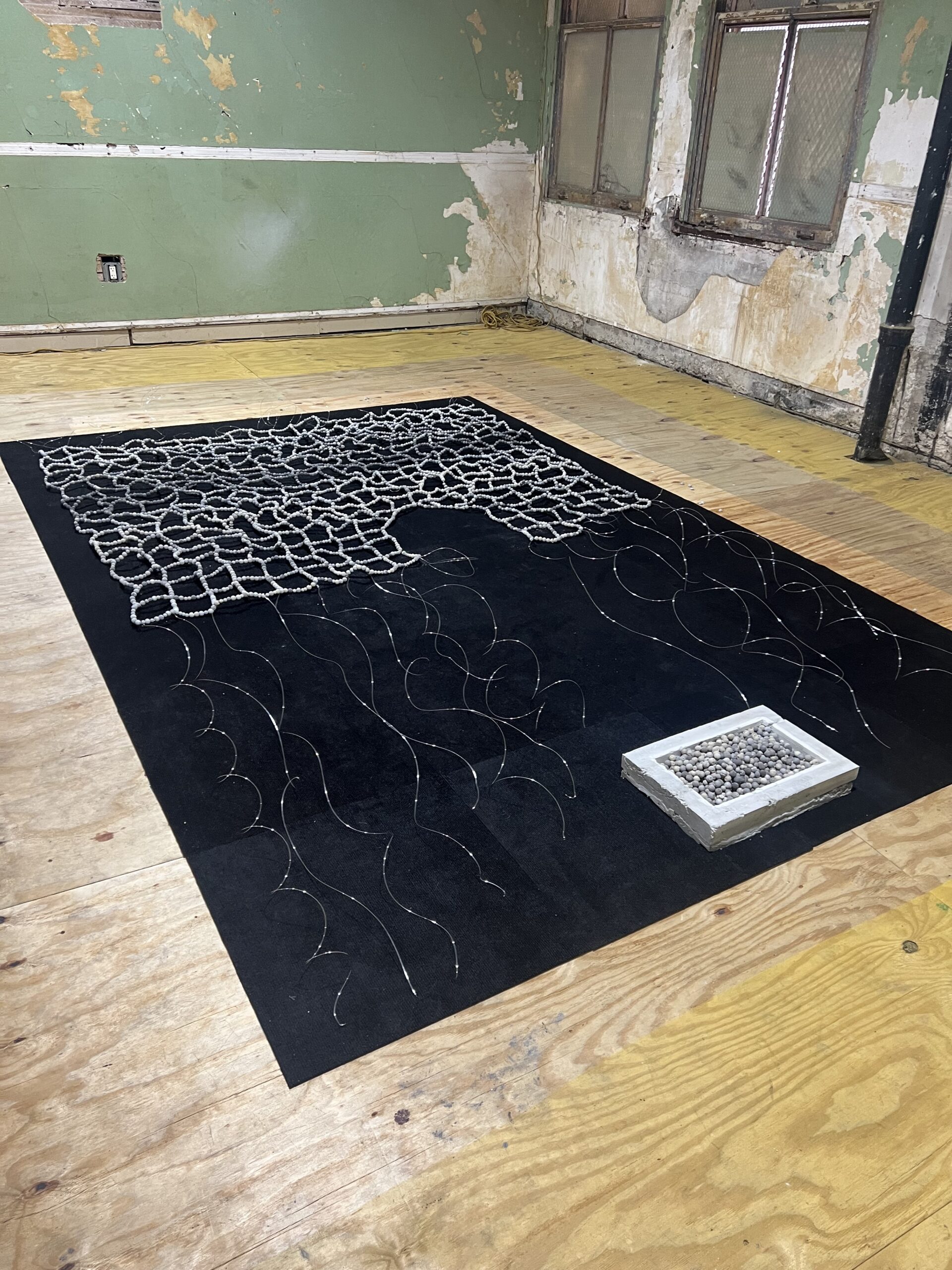 The back of the room features “Safety Net” (2025), a large tapestry made of concrete beads woven into a square pattern with wire, laid over a black tarp. The left side of the concrete beads gradient from gray to black and back to gray before the ends of the wire show through the right side of the work. Next to the nonwoven ends sits a tray of unused beads, some of which have seemingly spilled over and were crushed into dust by footsteps.