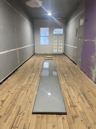 Through several calculations of length, width, and depth, Manzur achieves these different sizes while guaranteeing that each basin can hold an equivalent volume of water. The volume of the glass panels represents one day in water evaporation and a mosquito’s life. Within the Rice Hotel, this ideal evaporation rate is lost to the conditions of the building, since the lack of air conditioning means that the different rooms will be at different temperatures throughout the day. The water surface holds dust particles and the wings/ shells of bugs that inhabit the building, a sign of the wear and tear in the very space that hosts the work.