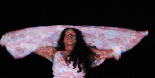 Still image from short dance film, Caracoles en Cemento. Image features projection onto local dancer Maryangel Monroy. Image credit Trish Gutierez.
