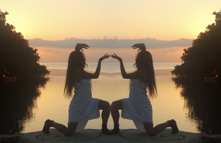 Still image from Caracoles en Cemento, a short dance film by Nicole Pedraza and Trish Guiterrez. Image captured at the Deering Estate featuring Nicole Pedraza dancing on the ‘Wishing Stone’, 1999 by Richard Medlock (Cast stone, tides, and people). Image credit Trish Gutierrez.
