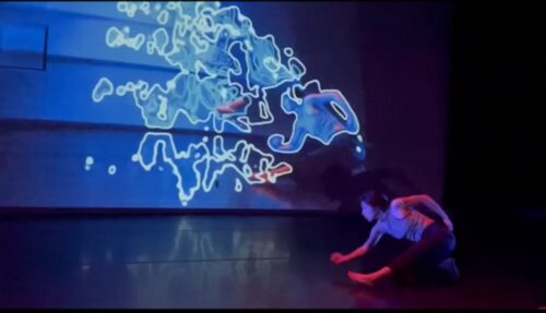 Nicole Pedraza dancing in foreground while real-time interactive visuals are projected onto both her and the wall. Image credit Trish Gutierrez.