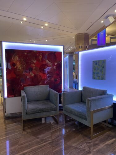 She also had paintings on display in the hotel’s lobby, small pieces made during Covid lockdown that she chose to use as her jumping off place. She got busy adding and using the adjustments available in digital media, where she could immediately undo the changes. “A large part of the beauty of the digital medium is flexibility, the ‘undo’ option, which does not exist for oil paint and resin,” said Parish.