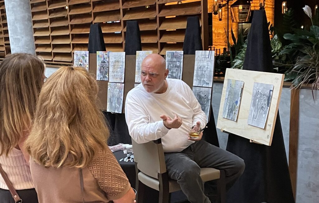 Noche de Arte Artist in Residence Ignacio Font talks with hotel guests about his art. Photo by Jean Blackwell Font, courtesy Font Squared.