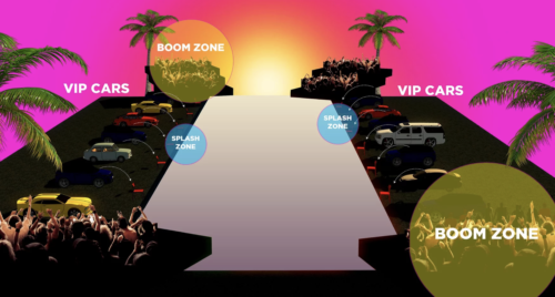 Attendees can choose to engage in the Boom Zone, which offers a global view of the performances, a Splash Zone for the more adventurous, or a VIP experience where individual performances are tailored to each car.