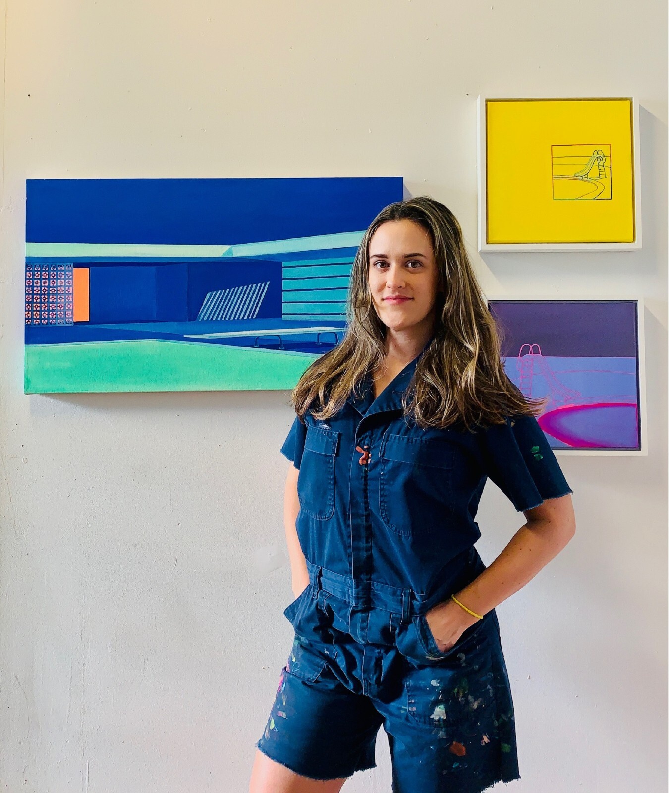 In the artist’s words, her “artistic motivation is experimentation.” In her paintings, she loves to explore the pool for “its significance in South Florida as a symbol of leisure, but also because of the push and pull it creates as a void within the canvas visually.” Smith explains that, for the most part, the pools are painted from vague memories combined with South Florida locations.