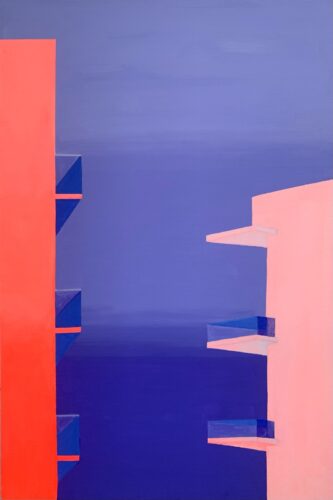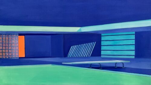 The pools in Smith’s exhibition are oil on canvas, with solid, intense colors––sometimes neon––and silhouettes of water slides that appear as simplified drawings. The water seems to glow in her nighttime scenarios. The artist explores contrast and balance in her work, blurring the lines between fantasy and reality. She wants her scenes to “make people think about the importance of play and space in our lives.” In this way, she explores how “the built environment affects emotional and psychological states.”