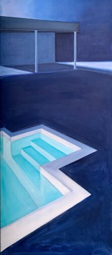 Smith finds it interesting how her paintings raise questions about the representation of the positive and negative spaces of the pool and the surrounding buildings. “Within the perspective,” Smith says, “a pool is kind of going under the horizon.” There’s a little push and pull,” she notes.