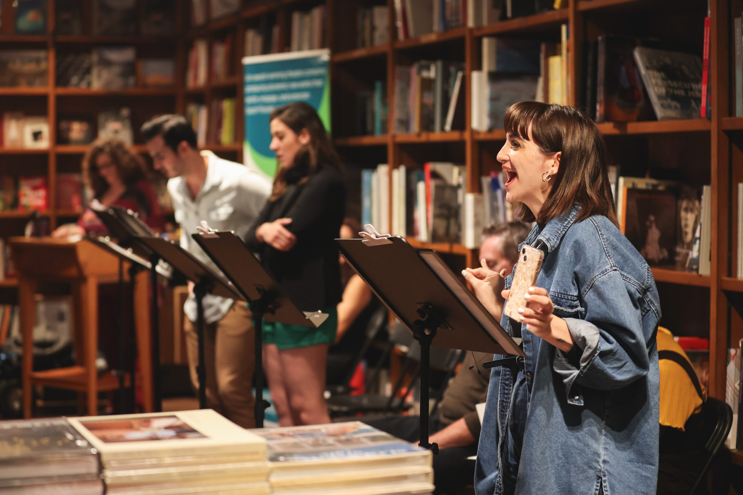 Image of City Theatre Artistic Director Margaret M. Ledford with City Reads actors at Books & Books – Photo by Morgan Sophia Photography