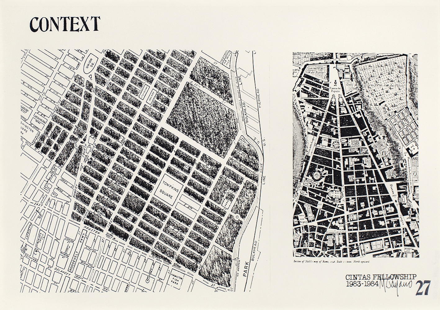 Context No. 27 by Manuel Quijano (Fellow 1983-84). Site Plan for Tompkins Square Park, New York City, and Section of Piazza del Popolo, Northern Rome (Map by Nolli). Courtesy of the CINTAS Foundation Collection.