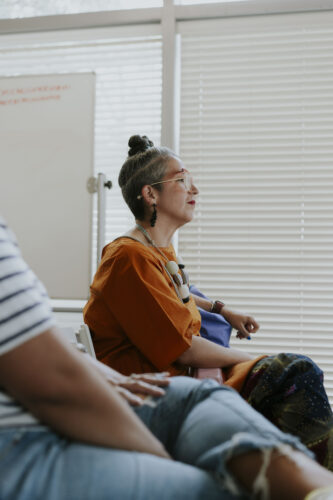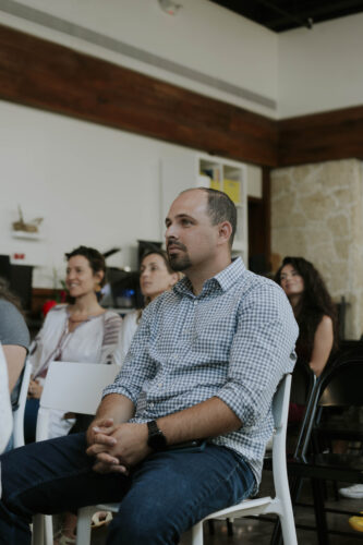 Andrew Ruiz listens attentively to Victoria’s talk during the June CreativeMornings Miami at Moonlighter Fab Lab on Miami Beach. Photo credit VACO Studio.