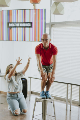 Audience volunteers act out speaker Victoria Collado’s improv prompt with scenario suggestions from those in attendance at CreativeMornings Miami. Photo credit VACO Studio.
