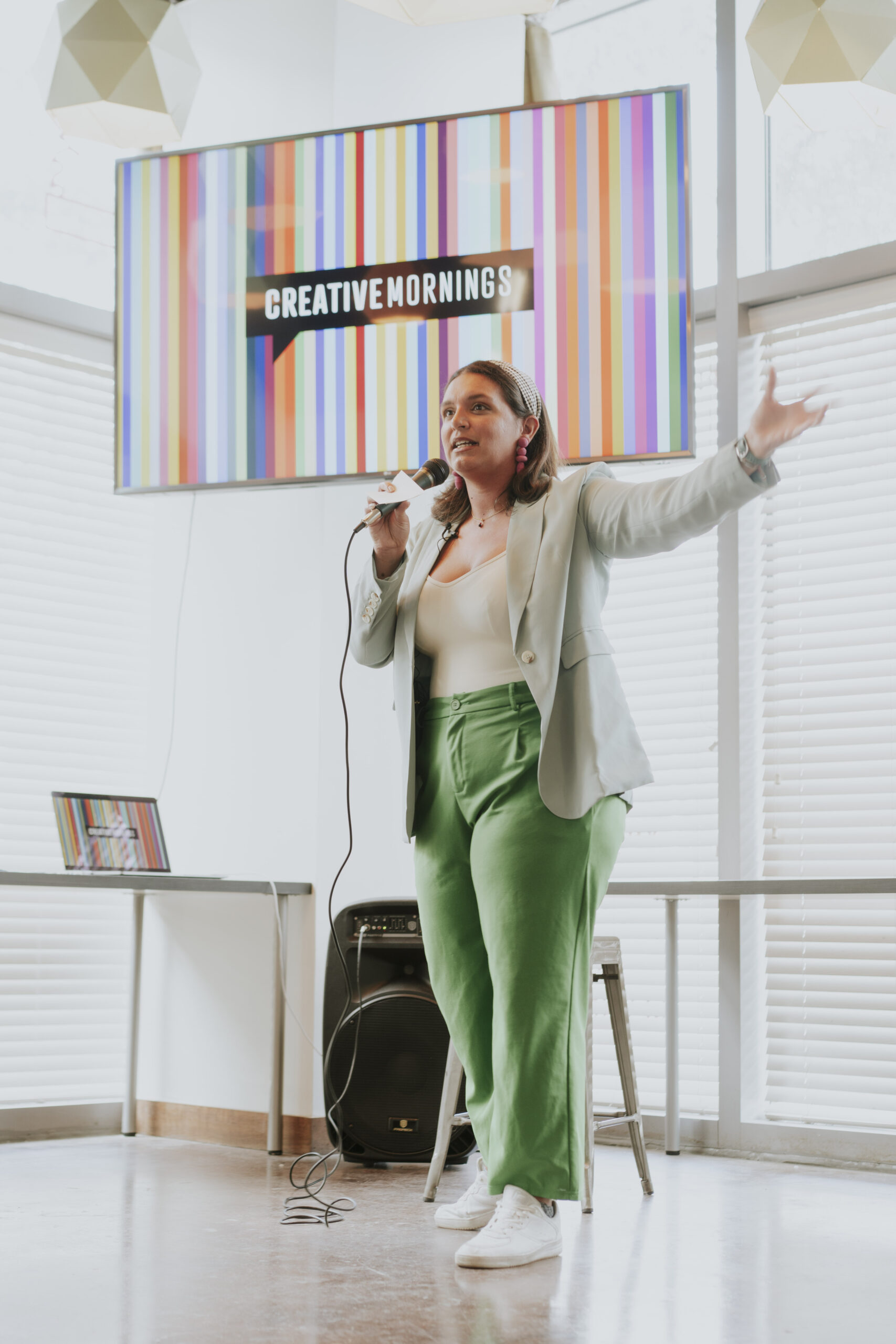 Victoria Collado speaking at June’s CreativeMornings Miami held at Moonlighter Fab Lab on Miami Beach. Photo credit VACO Studio.
