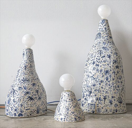 Only in Miami since 2022 after moving from Portland, Oregon, Brett Olivieri introduces humor and regionalism through lamp sculptures and a frieze decorated with alligators, palm trees, and tropical flora. These pieces echo tourist art and regional craft while pushing into Art with a capital “A.” “We Never Left Eden,” a lamp series that serves as both an object and an image, touches on themes of nostalgia and paradise as aesthetic concepts.