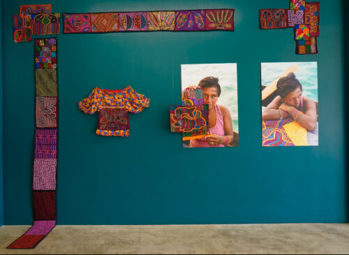 Dreszer, who was born in Colombia and raised in Panama, draws heavily from personal and cultural history. Many of the textiles included in the installation were passed down through her family, while others—specifically the molas, hand-sewn by Kuna Yala Indigenous women in Panama—connect the show to a broader cultural context. The elements underscore the exhibition’s themes of migration, heritage, and the preservation of identity across generations.