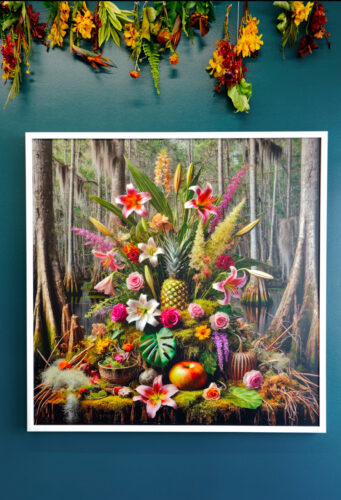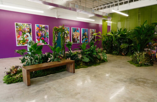 Artist Dahlia Dreszer has transformed the gallery into a space that feels like part garden, part living room. At the center are fabric and plant installations, and most of the flowers are rescued, originally used at a wedding at the Pérez Art Museum Miami (PAMM). Surrounding these are large-scale photographs, where flowers, plants, and textiles appear again, reinforcing the materials physically present in the space. The lively colors and detailed compositions create a strong visual impact.