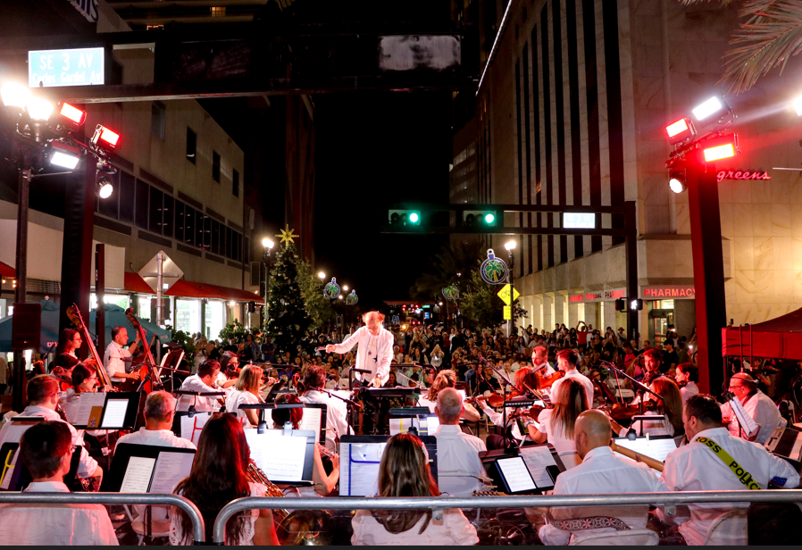 One of last year’s grant winners, Miami Symphony Orchestra (MISO), performs a 90-minute family program of holiday music at Miami DDA’s holiday lighting ceremony, held on November 17, 2023, on Flagler Street. (Photo courtesy of Miami DDA)