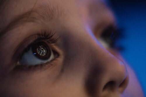 Young boy looking at “Gaia” art exhibition with the Earth reflected in his eyes, Gaia, at W5 in Belfast, 2019. Photographer or (Photo courtesy of Luke Jerram)