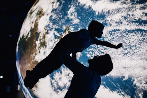 A boy flies towards the Earth with help from his father at the “Gaia” art installation at W5 in Belfast, 2019 (Photo courtesy of Luke Jerram)