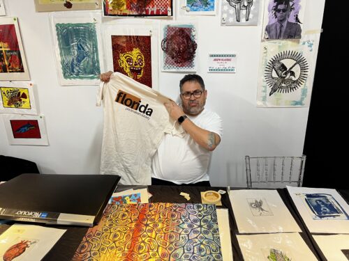 Running Florida Printmakers Society is something Drost and Reyes do in addition to their professional work. Drost is a professor and heads the University of Miami 2D Art Department; Reyes is busy as a full-time artist juggling three different residencies, hosting workshops in the community and underwriting projects with other artists.