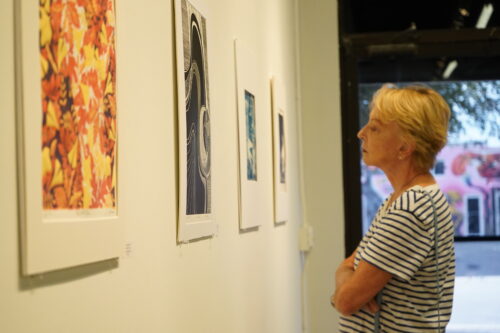 A visitor looking at prints at The Florida Printmakers Society 2023 Biennial Exhibition. Artworks from left to right: Jennifer Harper, Liliana Gerardi, Abby Kish, and Nat Pagan. Photo by Brianna Jimenez (Cielo Creative Co.)