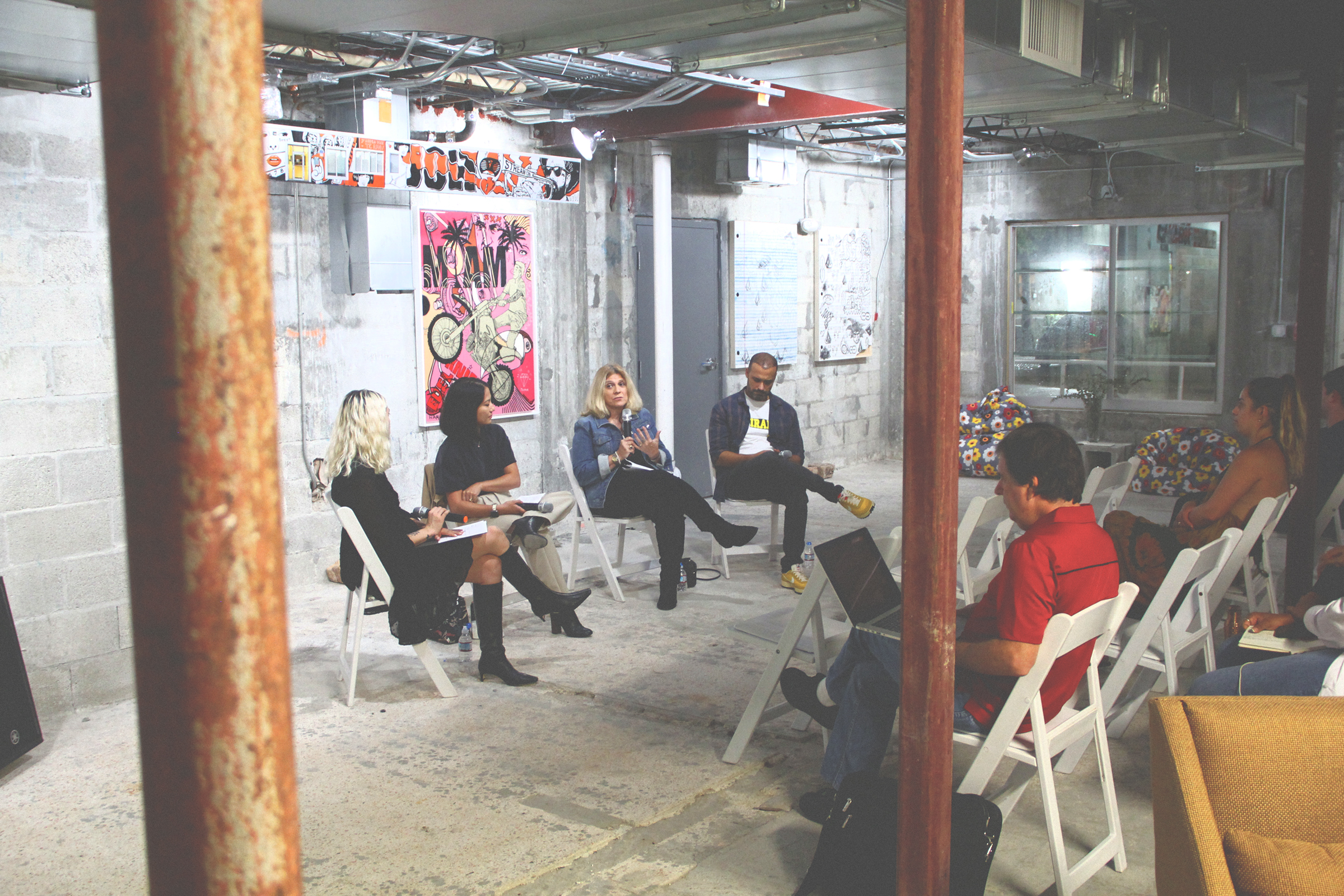 Held within their industrial yet welcoming nomadic gallery space, surrounded by the work of local artists Thomas Bils, Faloapas, Beth Rhodes and Dylan Matamoros in an exhibition entitled “Salad Days,” Aguilo along with speakers Michelle Solomon, Artburst Miami and Miami ArtZine editor and Allyn Gin Ayers, director of LegalARTLink at Locust Projects, shared their insight on the evening’s topic. Florencia Franceschetti, founder of Raygun Agency, served as moderator.