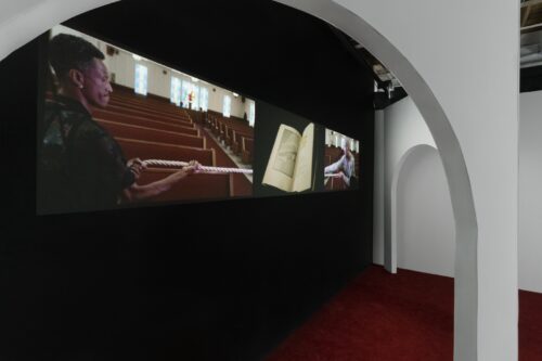 Leila Weefur’s PLAYPREY is a four-part film. Upon entering, it is complemented by audible dialogue, a red-carpeted space, a white architectural installation meant that assists in the exploration of youthful play. Weefur’s work touches upon the manifestation of desire, and latent aggression that impacts queer black children’s experiences in the Christian Church.