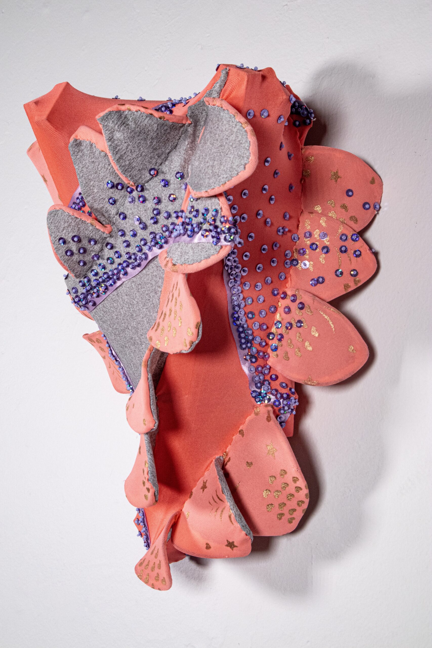 Self-Referential is a material and process-based body of work where she begins with a maximalist fiber assemblage sculpture; created from scrap wood, steel wire, thrifted clothing, and industrially produced products typically found in craft stores such as sequins and beads.
