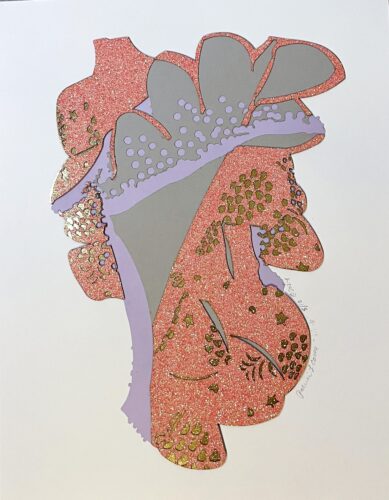 Cooke says the breadth of her work is tied together via investigation of feminine-gendered materials, colors, shapes, textures, processes, and imagery. “These investigations appear as sculptures that hang on the wall; intimate compositions which are beautiful at first glance but err on the side of grotesque. Amalgamations of faux flowers or vintage lace are imbedded within substrates of odd angles and obtrusive shapes,” she said.