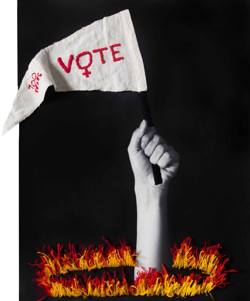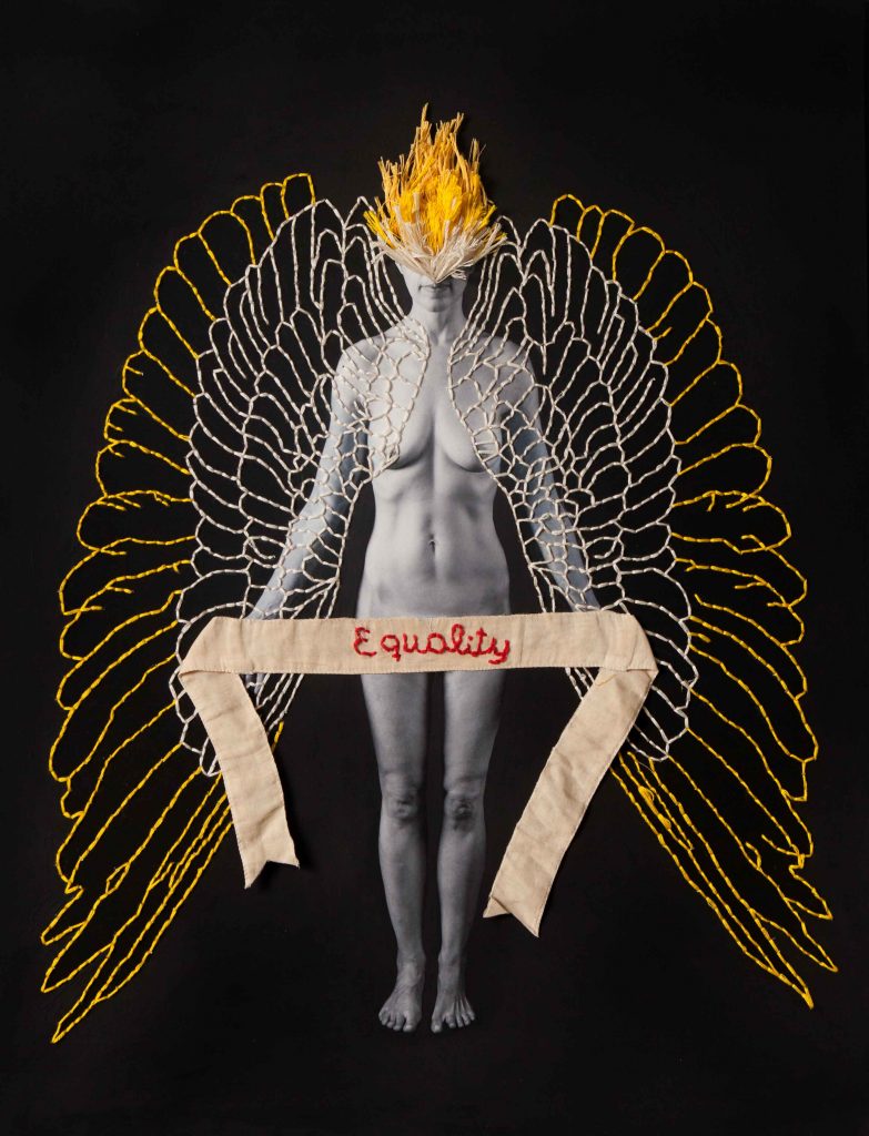 Equality, for A Yellow Rose Project, 2020 archival pigment print on cotton rag paper, gesso, textiles and thread. 22 x 17 inches. Photo courtesy of Marina Font