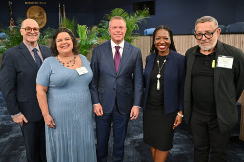 At the 2026 State of the Arts Address, Miami Dade Cultural Affairs Assistant Director Graham Winick_Poet Laureate Caridad Moro-Gronlier_Cultural Affairs Council Chairman Brian E. May_Interim Director Ashlee Thomas_County Artist-in-Residence Edouard Duval-Carrié. (Photo courtesy of Miami Dade County Cultural Affairs)