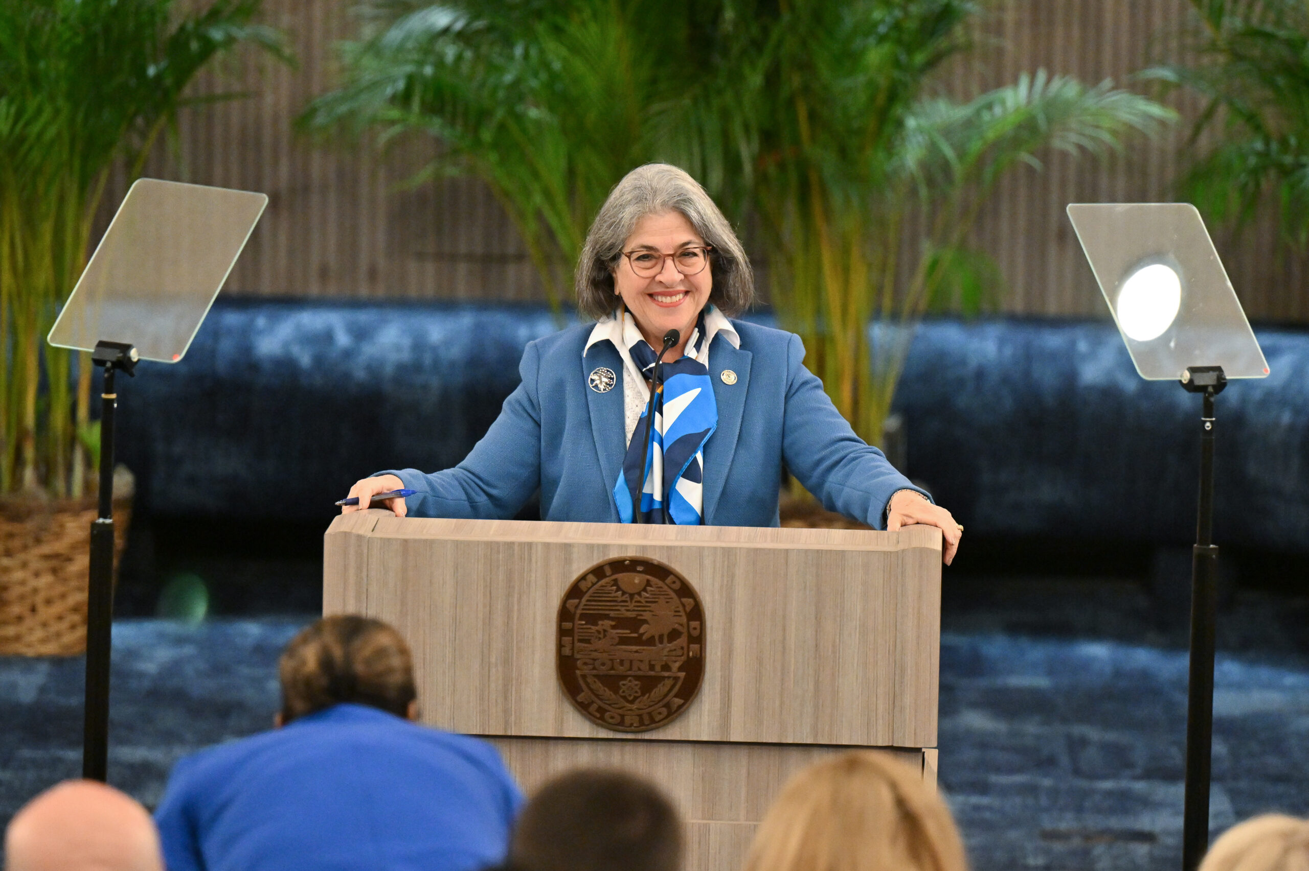 Mayor Danielle Levine Cava speaks at the 17th annual State of the Arts for Miami-Dade County held in the County Commission Chamber of the Stephen P. Clark Government Center on Thursday, Feb. 12. (Photo courtesy of Miami Dade County Cultural Affairs)