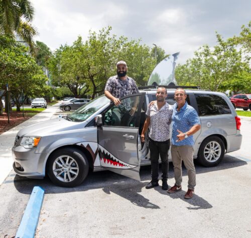 South Beach Shark Club Crew: L-R Robert Requejo Ramos, Pedro Gomez and Dan Arriola with their South Beach Shark Club minivan which they drove around Miami promoting their award-winning Miami Film Festival documentary “South Beach Shark Club.” Photo courtesy Dan Arriola of The Happy Customer Channel.