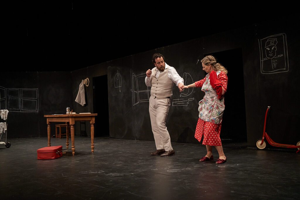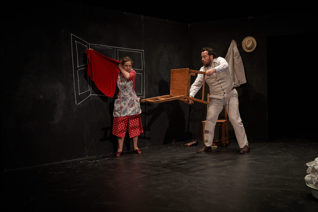 At first the set seems quite bare, a few chairs upturned on a table and hanging black chalkboards, but that’s the beauty of the minimalist set. Antonietta is a bored housewife going about her mundane tasks at home who meets Gabriele, a persecuted journalist. Little by little, Gabriele’s charm, wit and ultimate secret present Antonietta with the day’s distraction, taking the audience through the highs and lows of their own lives as well as those of the world outside.