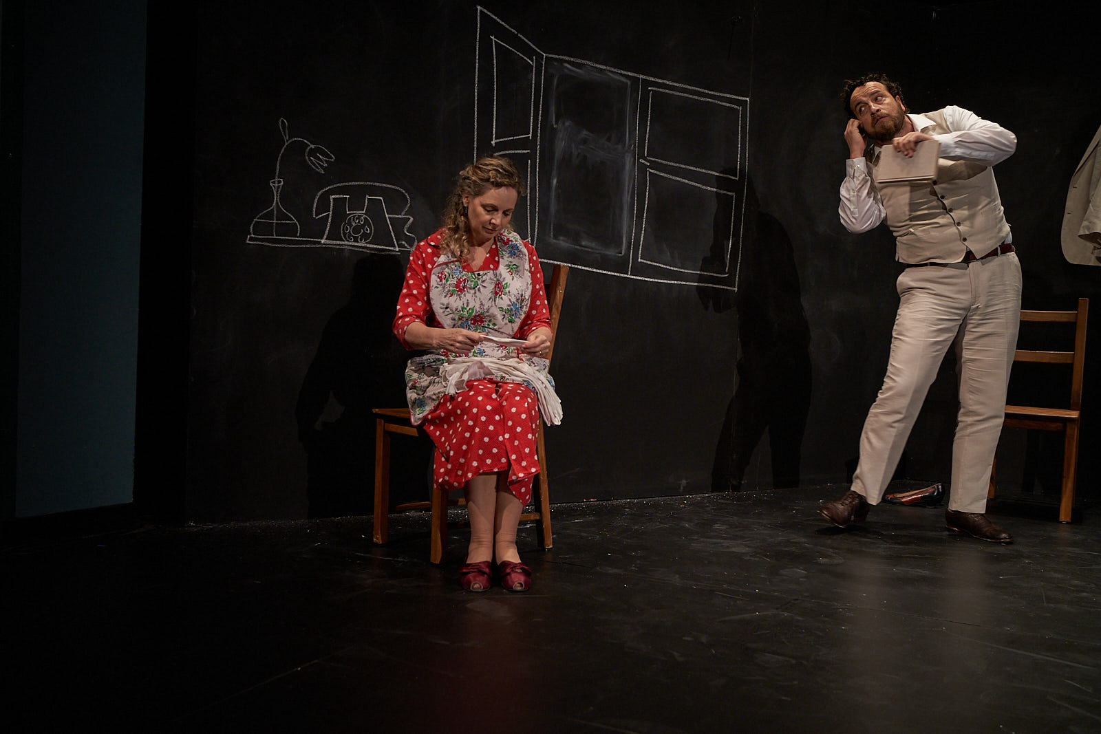 That cage, the windows, a mirror, kitchen utensils, a stove and more are imaginatively created by the two actors using chalk on the hanging blackboards. Their artistic talent expands beyond their roles on stage and keeps the audience intrigued as to what prop they’ll draw next. Aside from the drawings, the two share duties actually playing the props like a doorbell ringing, the parrot squawking and other assorted noises.