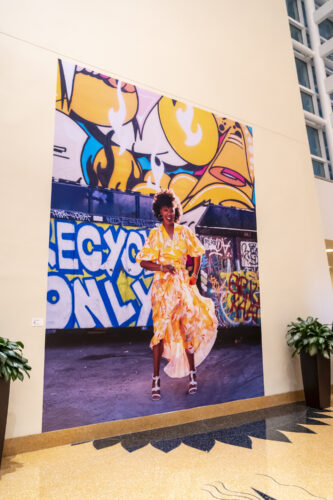 A photo of former Miami Shores Mayor Crystal Wagar dancing in front of the Wynwood Graffiti Museum is the exhibition’s opening piece at the center’s Knight Concert Hall. Photo credit WorldRedEye.com.