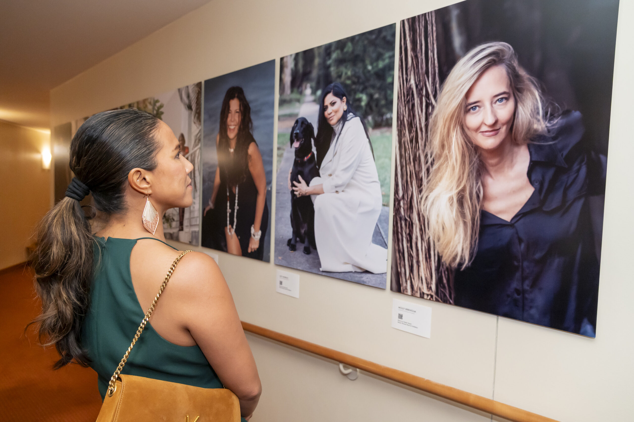 Featured in “Miami Women” herself, Sandra Abi-Rashed, founder of nonprofit mentoring organization Mentoro, admires a portrait of Molly Birkholm, a yoga and meditation instructor. Photo credit WorldRedEye.com.
