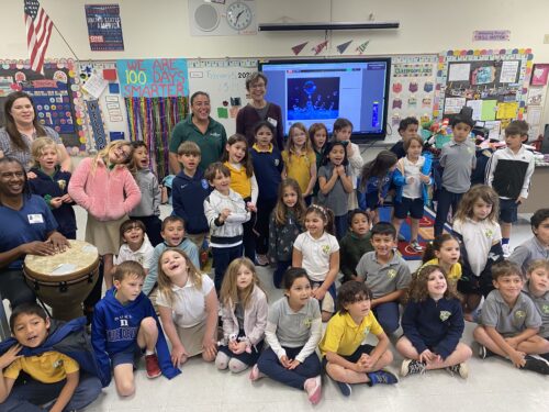 Pinecrest Elementary in-school Water Dance workshop as part of Live Arts Miami’s EcoCultura programming in the Green Schools Challenge. Photographed (from L to R) seated, percussionist Ray Robinson, Vanina Armenteros (teacher), Barbara Martinez Guerrero (ED Green Schools Challenge) Dale Andree (Director, NWD Projects) February 5, 2024. Photograph courtesy of Live Arts Miami.