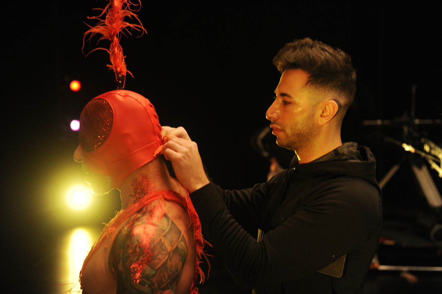 Pioneer Winter ajusta el vestuario de Frank Campisano para “Birds of Paradise”. Fotografía: WorldRedEye.com (cortesía del Adrienne Arsht Center for the Performing Arts)