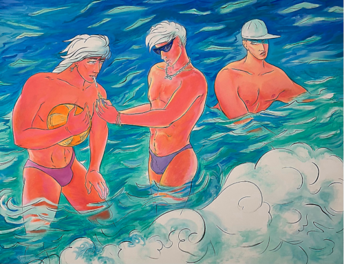 Rocío García’s paintings, currently on view at Fredric Snitzer Gallery, echoes humanity’s timeless storytelling impulse. In her collection of eight paintings, García invites spectators to peer into scenes that evoke a staged performance, an open invitation to the voyeurism of the film “Rear Window” with homoerotic undertones.