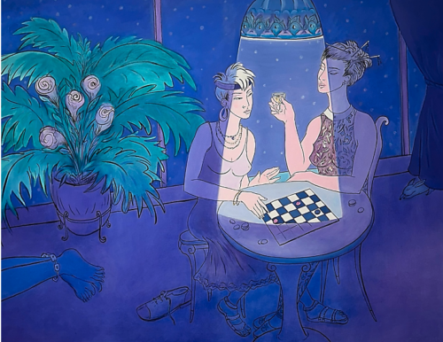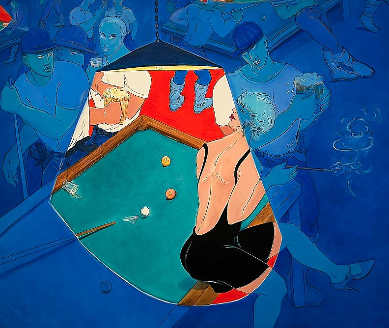The scenes are inhabited by carefully dressed or specifically nude men and women, mildly eroticized. Decidedly gay men and lesbians are the players in these psychodramas, which adds another layer of mystery and specificity, except they are not doing anything out of all human experience. These characters are not fantastical, they seem to be the landscape of her experience: bars, boudoirs, beaches, a café, a pool, and a living room.
