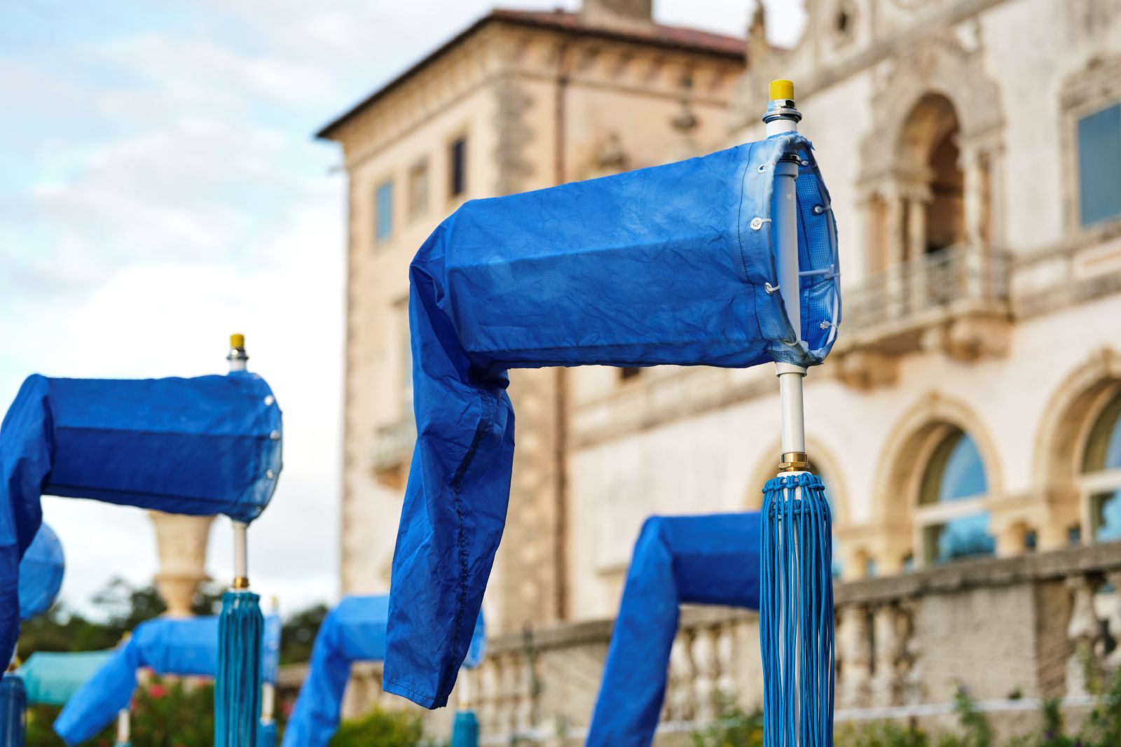 Along the bayfront, the windsocks rise in shades of blue that echo the sky and the sea. Headwind” by Susanne Schirato, commissioned by the Contemporary Arts Program (CAP) at Vizcaya Museum and Gardens, 2025. (Photo by Rodrigo Gaya, courtesy of Vizcaya Museum and Gardens)