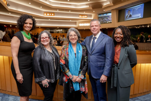 At the 2025 State of the Arts in Miami-Dade County Address, from left, Cathy Burgos, Chief Community Services Officer, Office of the Mayor, Marialaura Leslie, Director of the Miami-Dade County Department of Cultural Affairs, Miami-Dade County Mayor Daniella Levine Cava, Brian E. May, Chairman of the Miami-Dade Cultural Affairs Council, and Ashlee Thomas, Deputy Director, Miami-Dade County Department of Cultural Affairs. (Photo courtesy of Miami-Dade County)