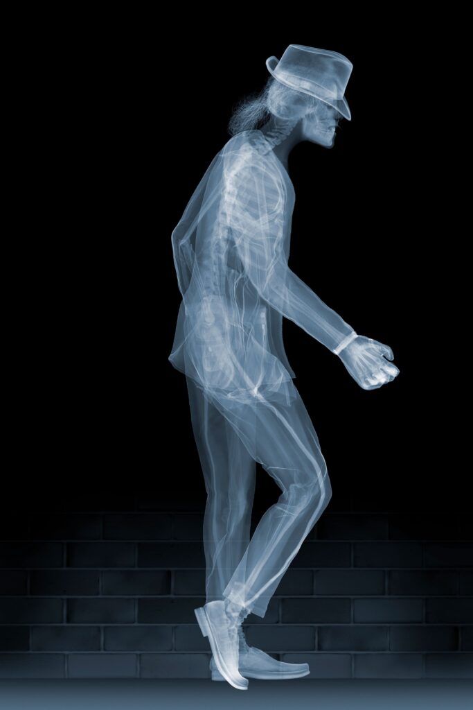 Veasey uses industrial x-ray machines. Unlike a typical medical x-ray, Veasey uses techniques that require much more time to expose the subject to radiation. In order to get crisp enough images, he bombards some objects with radiation for up to ten minutes. Since this is considered unsafe for living creatures, Veasey uses skeletons in rubber suits or dead bodies to capture the human form.