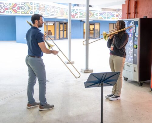 Assistant Principal Trombone Shachar Israel of The Cleveland Orchestra, left, has a one on one lesson with student Maya Samuels at the African Heritage Cultural Arts Center. (Photo by Gregory F. Reed)