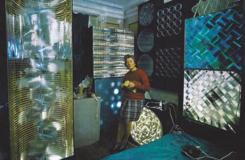 Martha Boto (Buenos Aires, 1925 – Paris, 2004) posing at her Paris studio alongside her kinetic and luminic boxes. Boto is quoted as saying, “I have always been fascinated by the laws of harmony and equilibrium which govern the cosmos through interrelations of light and movement, space, time, and color.” (Photo courtesy of Maman Fine Art Gallery)