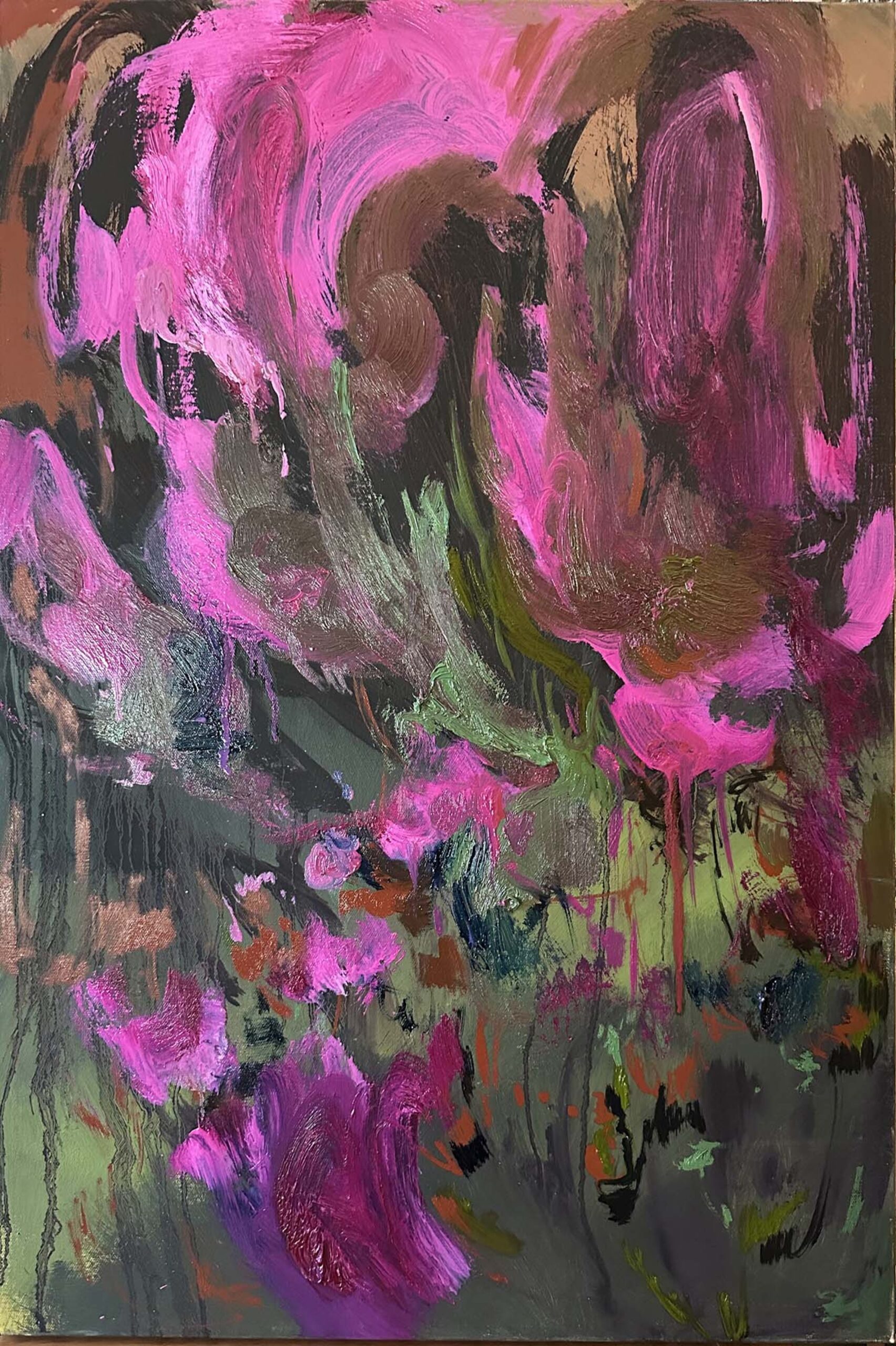 The artist’s gestures start at the top, as if “off screen.” This reflects Degas’ use of photography, framing an image as if seen through a window rather than the wider visual field, a historically significant development for artists in painting. Her gestures are subject to the pull of gravity. The overall coloration is tonal, except for Peonies. Here, the fuchsia dominates, serving as the subject matter and capturing the beauty of flowers in full bloom.