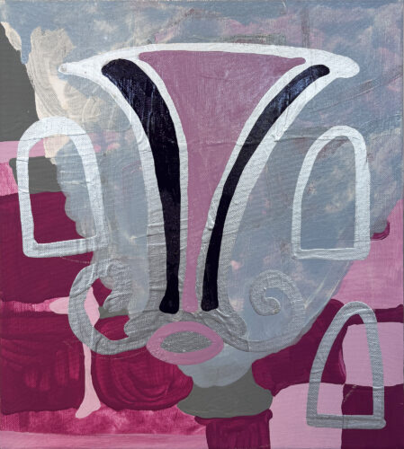 Smith’s paintings line the walls in counterpoint to the heaviness of Casto’s hand. Her mark-making is a facile calligraphy dancing, creating the rhythm and illusion of space through size and intensity of detail. One can sense the immediacy and the energy with which her hand moves. The imagery feels specific yet sometimes unintelligible, staying with abstraction, open to interpretation. A simple line drawing of a face feels like unresolved shorthand and contrasts fluency of her line. She, like Martinez, uses vibrational color. She is drawing as much as painting with the brush. They have a tempo, each swift mark like notes in a music score, establishing a rhythmic scaffolding for color. She describes her process as “living in the moment” of the brushstroke, treating abstraction as a space of risk and reinvention.