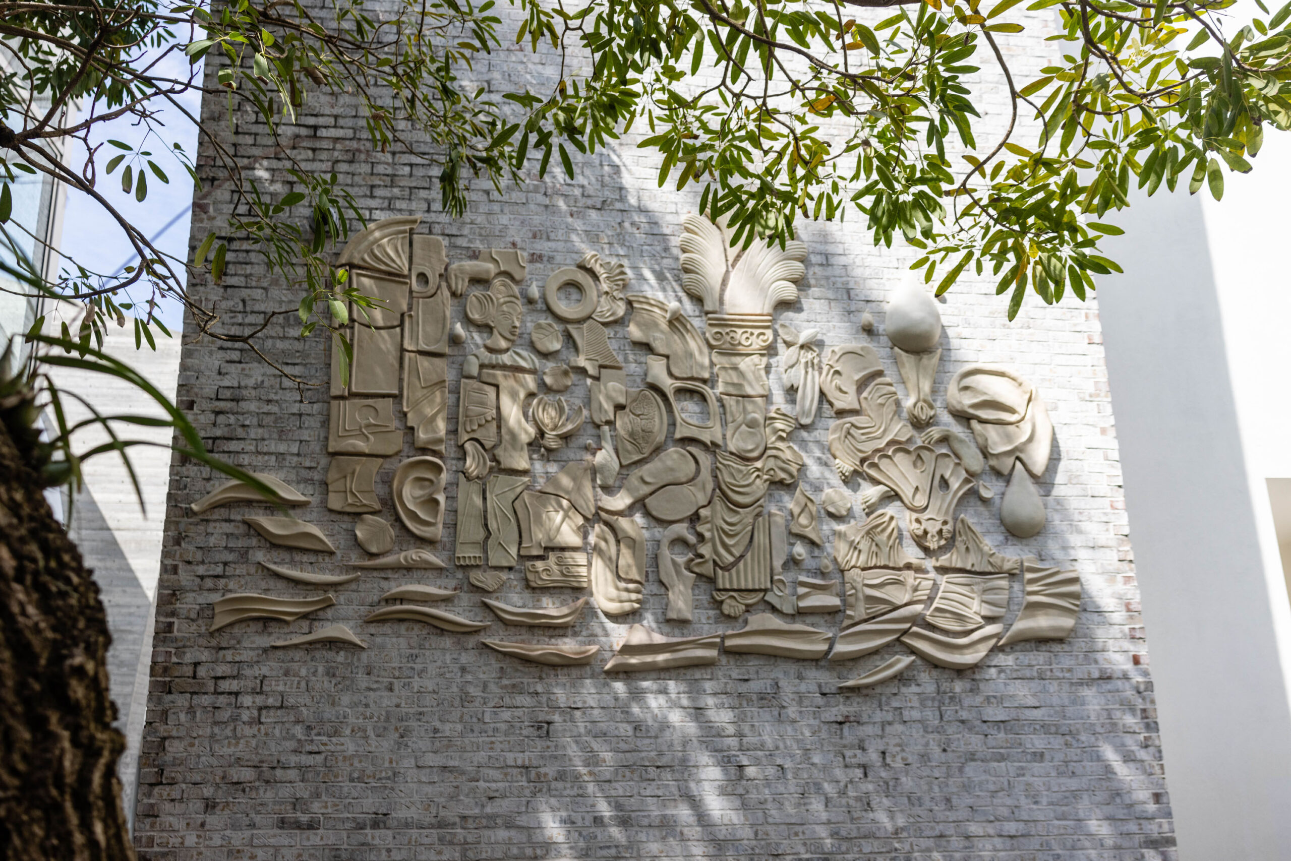 I couldn’t have dreamt of a better site for this mural than the Court at Jade Alley in the Miami Design District, integrating new and existing buildings with the parabolic concrete walls and the brick wall patina with visible signs of aging, together with the stoneware ceramic pieces and cobblestone pavers declares these objects have history.