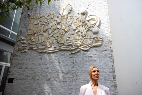 Nina Surel in front of Allegory of Florida, installed in the Miami Design District. Photo courtesy Miami Design District.